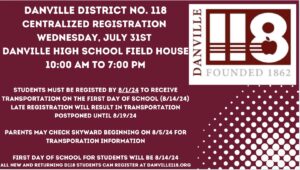 Please REGISTER your child(ren) ASAP. Online REGISTRATION is available at www.danville118.org/registration FREE school supplies will be provided for all students in Kindergarten through Grade 12