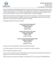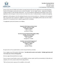 January 30, 2024, January 31, 2024, and February 1, 2024, the Vermilion Housing Authority will accept pre-applications for the Housing Choice Voucher (HCV) program (commonly