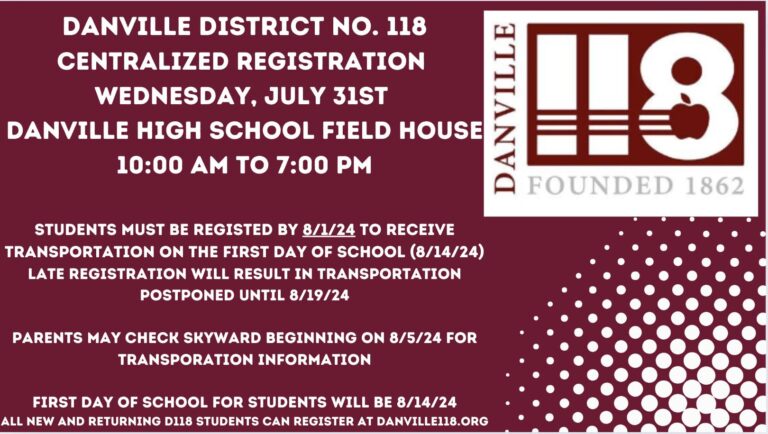 Uncategorized D118 Centralized Registration Please REGISTER your child(ren) ASAP. Online REGISTRATION is available at www.danville118.org/registration FREE school supplies will be provided for all students in Kindergarten through Grade 12 Read More » July 29, 2024 No Comments